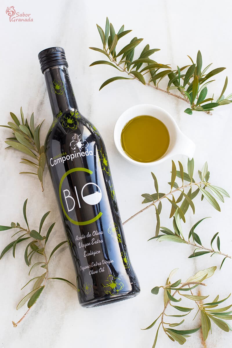 Para elaborar la receta hemos puesto el AOVE Bio de la Almazara Campopineda de Piñar, es un aceite ecológico frutado verde, con aromas a hierba fresca y tomatera, y con un ligero picor y amargor debido a su mezcla de variedades autóctonas: picual, loaime y lechin de la zona de los Montes Orientales. Las aceitunas se recogen en la primera quincena del mes de noviembre de sus árboles centenarios, y su producción se obtiene solo con procedimientos mecánicos y extracción en frío.