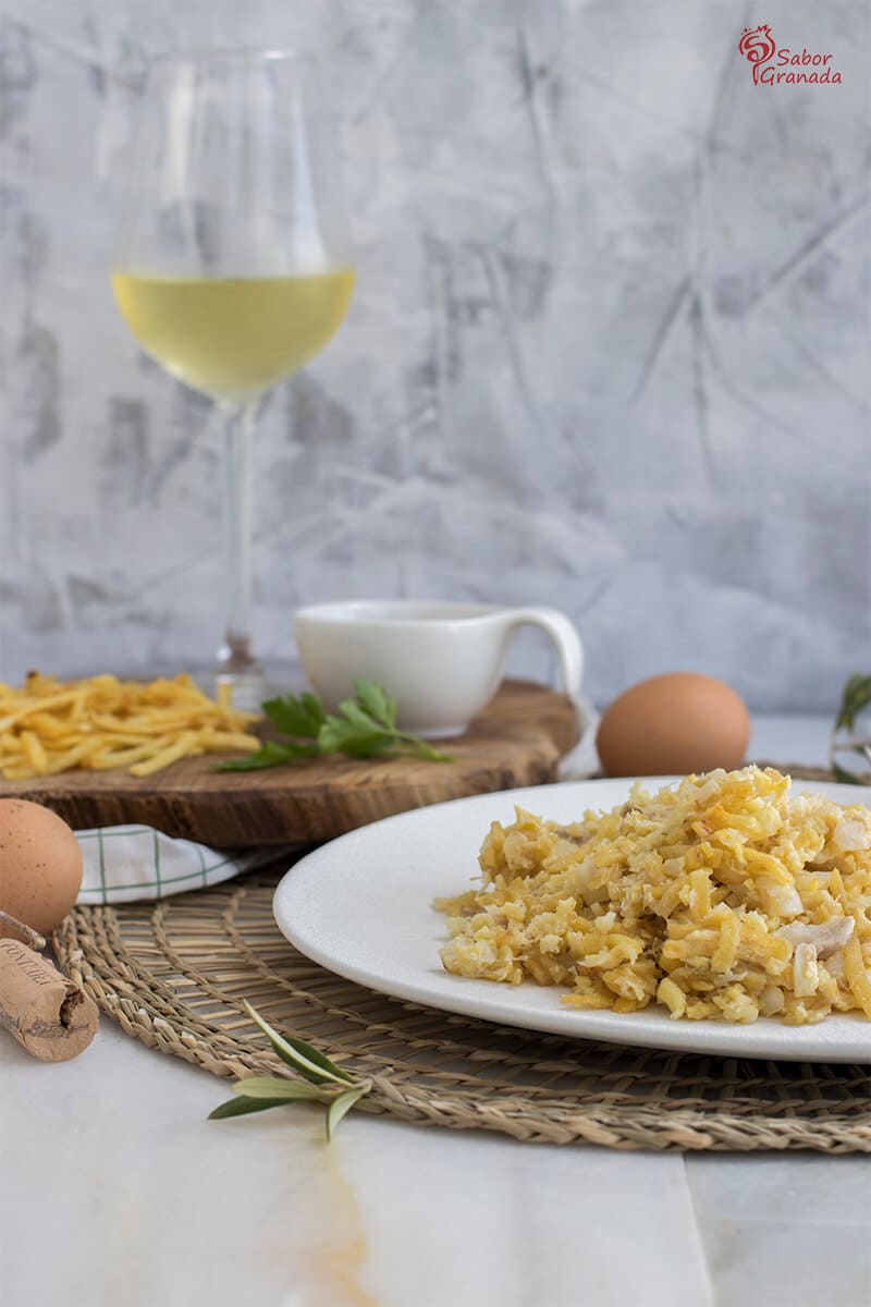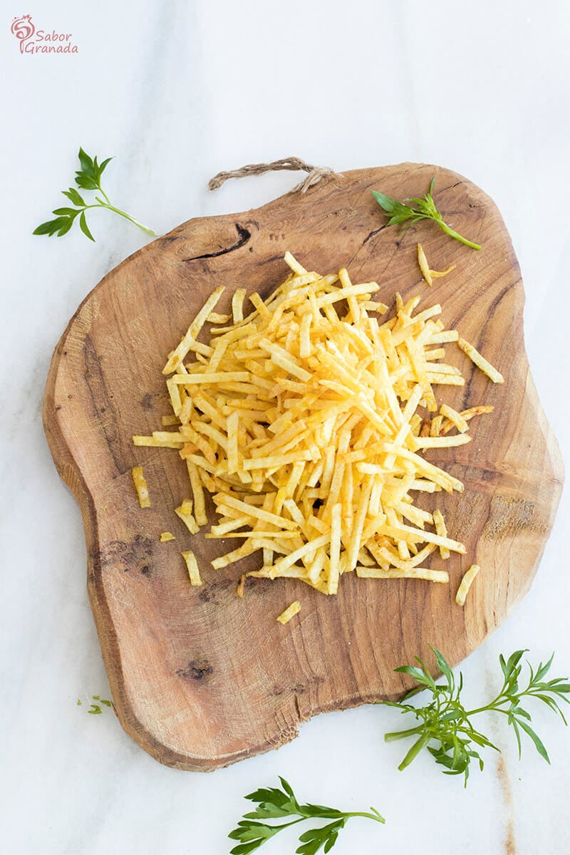 Las patatas que he usado para la receta son patatas fritas paja que son con las que tradicionalmente se hace la receta, podéis hacerlos vosotros mismos rallando patatas y friéndolas después, aunque es más cómodo preparar la receta con patatas de bolsa, como las de Peñagallo, empresa de Dúrcal que se dedica a la fabricación artesanal y tradicional de patatas fritas con la mejor materia prima.