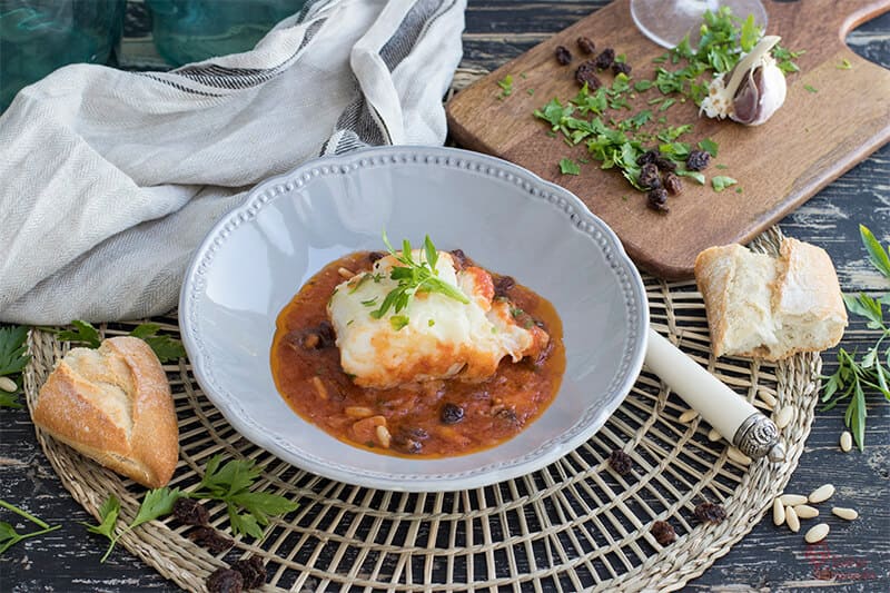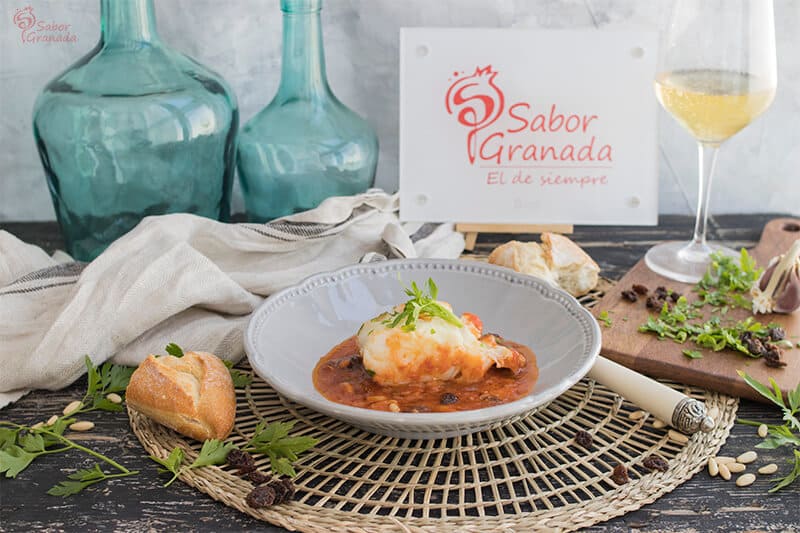 Enharinamos los trozos de bacalao y los freímos en una sartén con un buen fondo de AOVE. Reservamos. En esa misma sartén y sin retirar el aceite añadimos los dientes de ajo fileteados y doramos, entonces añadimos el tomate rallado, el caldo, las pasas y los piñones.