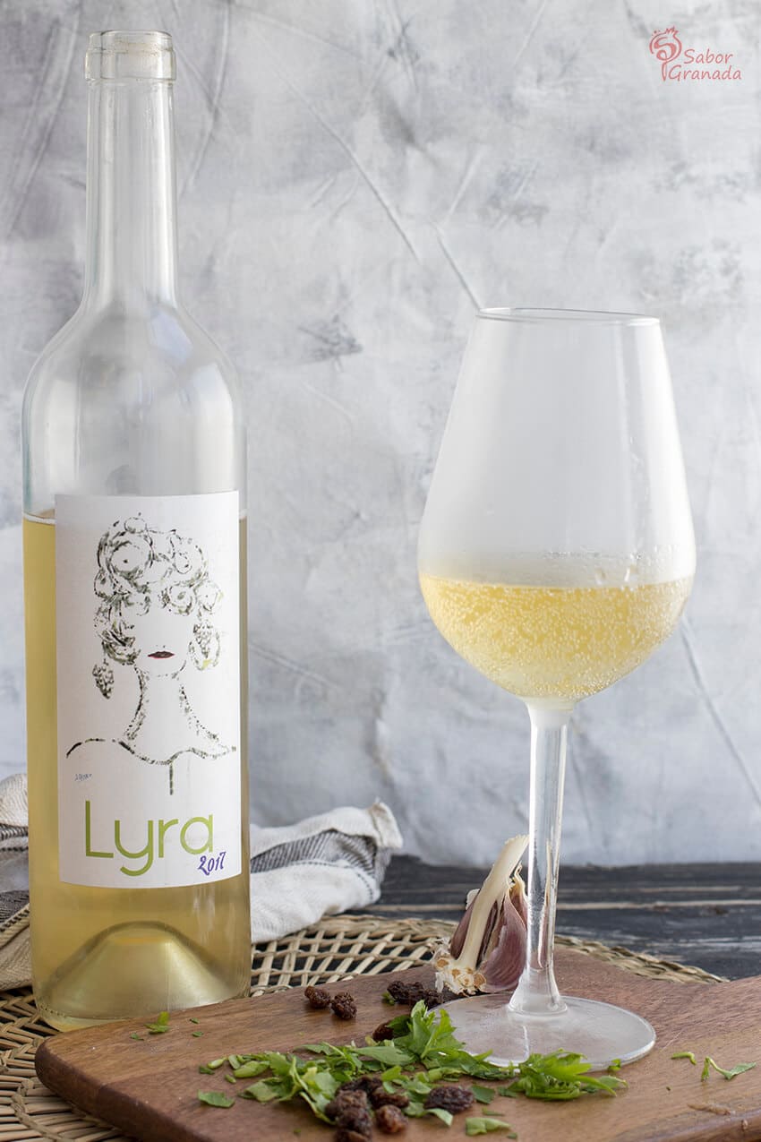 Y lo hemos maridado con otro gran vino blanco de Granada, el Lyra de Bodegas Vertijana, un vino con nombre de constelación, un vino chardonnay ecológico refrescante y estupendo que nos traen desde la bodega de Polícar, y que, como sus otros vinos, está galardonado con multitud de premios.