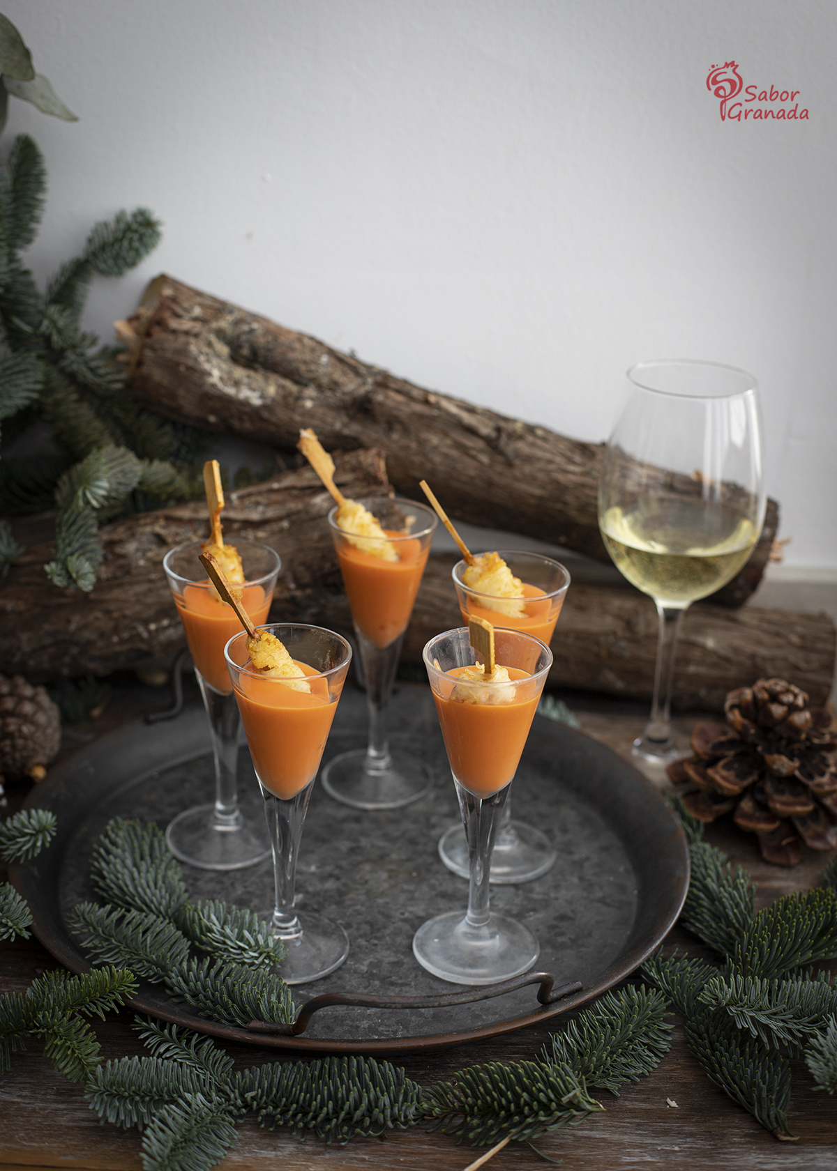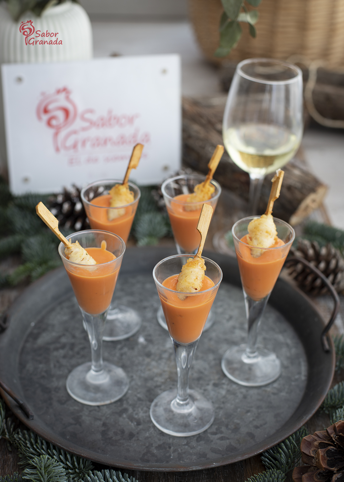 Una gran parte del protagonismo de las comidas navideñas se lo llevan los aperitivos, imprescindibles ya para cualquier comida o cena navideña. Por eso todas las ideas que podamos aportar para preparar nuestros menús son bienvenidas, y por ello, hoy os enseño a preparar un aperitivo muy rico y con una forma muy coqueta de presentación, un crujiente de gamba con chupito de salmorejo.