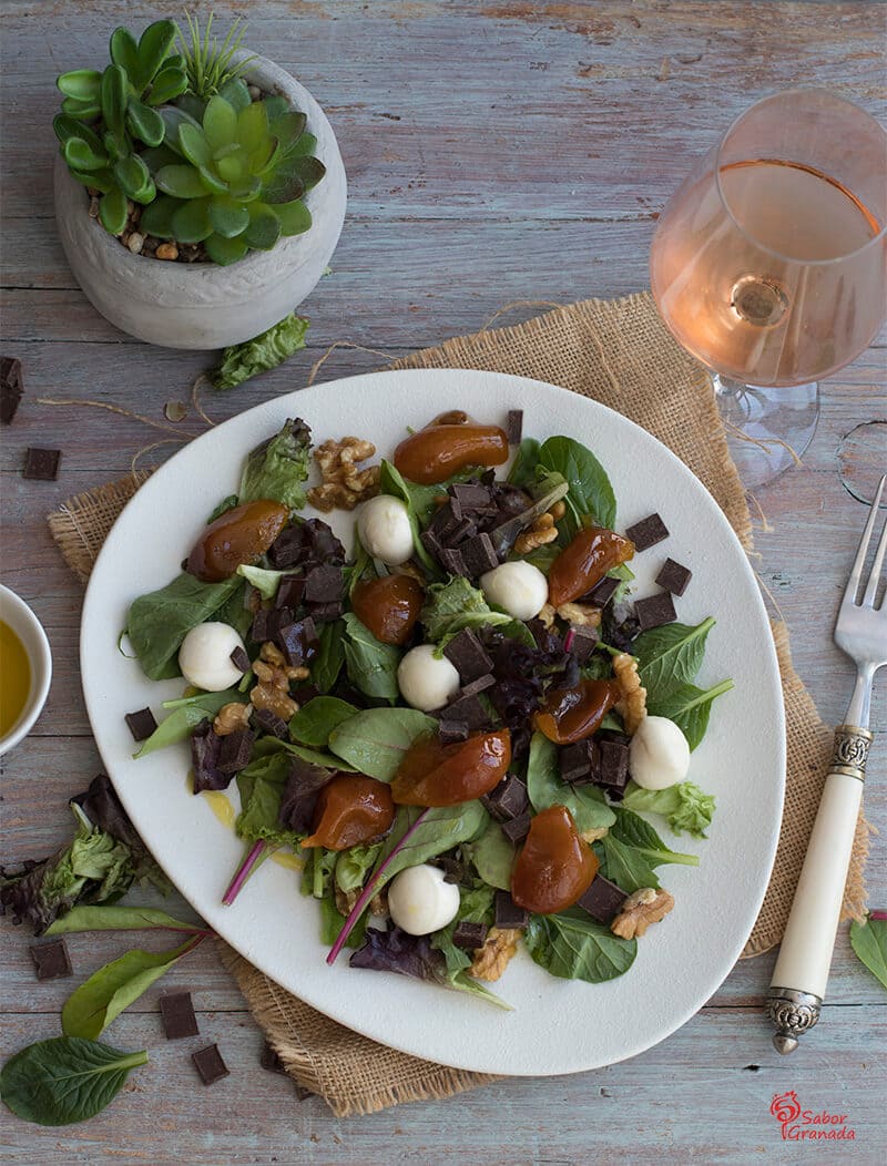 Sin darnos cuenta ya casi estamos en la época estival y las ensaladas empiezan a formar parte de nuestros menús diarios, y para no aburrirnos con la típica ensalada de siempre hay que ir variando nuestro recetario. Así que mí propuesta para hoy lejos de parecer arriesgada, en una ensalada muy especial en la que los ingredientes casan a la perfección. Chocolate y kumquat en almíbar con una base de brotes tiernos y regados con un AOVE de premio, además de incluir en la combinación unas nueces y queso.