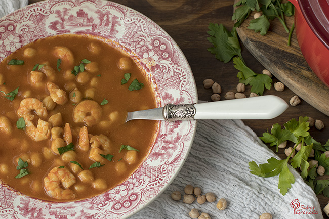 Una vez terminado el tiempo de cocción de los garbanzos los colamos y lavamos. El caldo de las cabezas de los langostinos lo colamos y reservamos, poniendo en la olla donde vamos a terminar la cocción del guiso. Añadimos al caldo el sofrito y los garbanzos. Cocinamos a fuego lento hasta que los garbanzos estén completamente cocidos y el guiso haya cogido consistencia. En los últimos cinco minutos al fuego añadimos los langostinos pelados y unas ramitas de perejil picadas. Servimos.