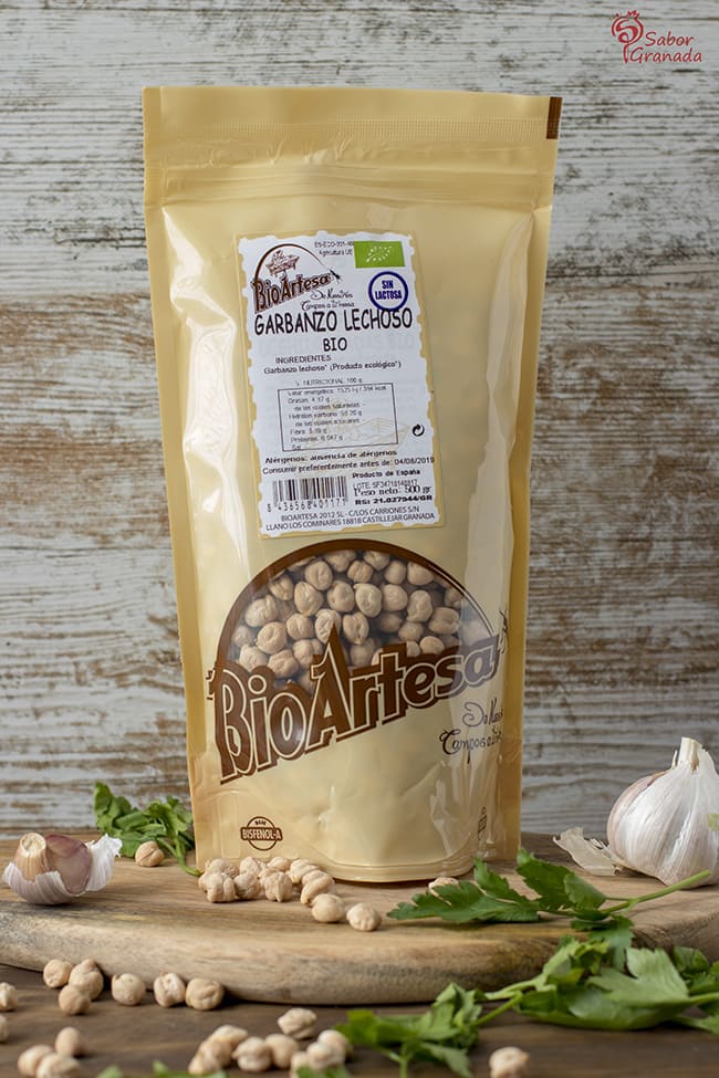 He usado los garbanzos lechosos de Bioartesa, una empresa de Castillejar, adherida a Sabor Granada, cuya finalidad es acercar los productos frescos, ecológicos y locales a nuestra mesa. Desde panes, magdalenas, galletas ecológicas, todo ello pasando por frutas deshidratadas, frutos secos, especias, pastas, legumbres, infusiones, harinas, y acabando hasta con un vino blanco ecológico comercializan. Un amplio catálogo que seduce por su variedad y además por ser ecológico.