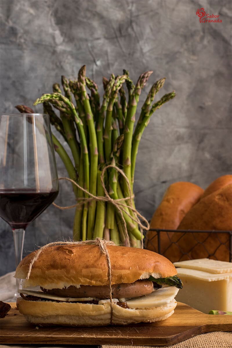 Mientras tanto vamos preparando el panecillo, abrimos y untamos el panecillo con chutney de calabaza e introducimos unas lonchas de queso. Una vez que estén preparados las salchichas y los espárragos introducimos dentro, completando nuestro hot dog (depende del tamaño del panecillo, yo he puesto dos salchichas y dos espárragos por panecillo).