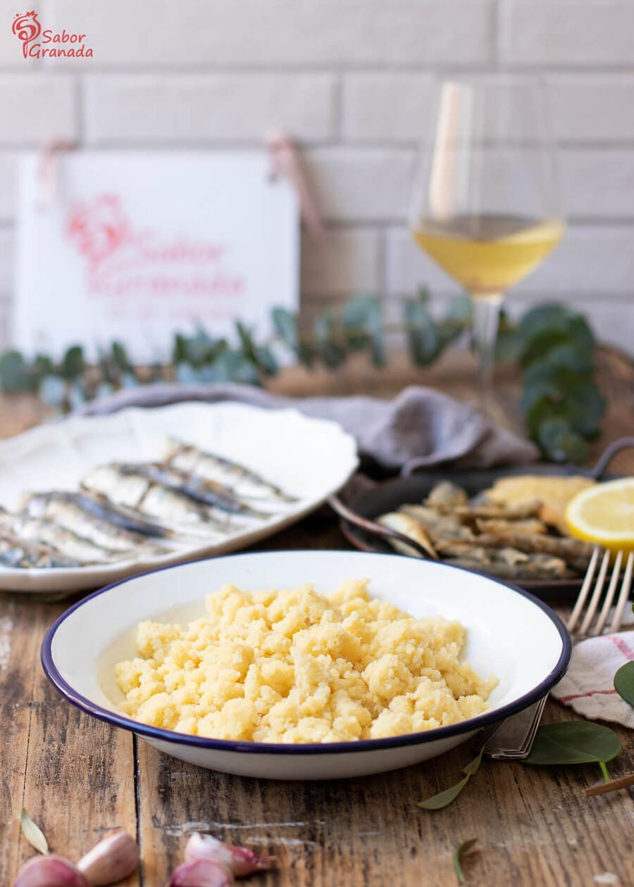 Podéis acompañarlas con unas sardinas a la plancha (yo las hago en la plancha dentro de un paquete de papel de aluminio y le doy la vuelta para hacerlas bien por ambos lados, pero el papel de aluminio os evitará el desagradable olor de las sardinas). También hemos acompañado con boquerones fritos y bacaladillas, pero podéis ponerle el pescado que más os guste. O incluso acompañarlas de longaniza, panceta…, aunque yo ese acompañamiento lo dejo para las migas de pan.