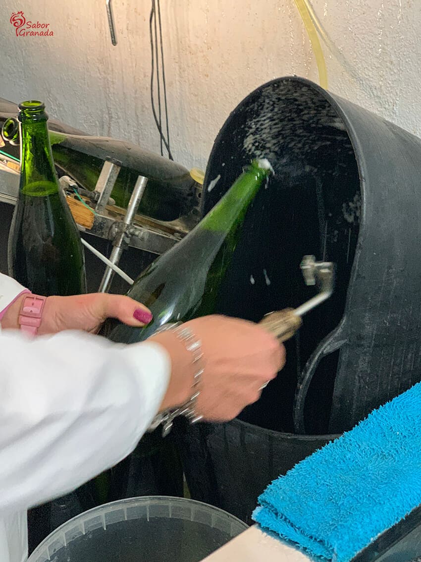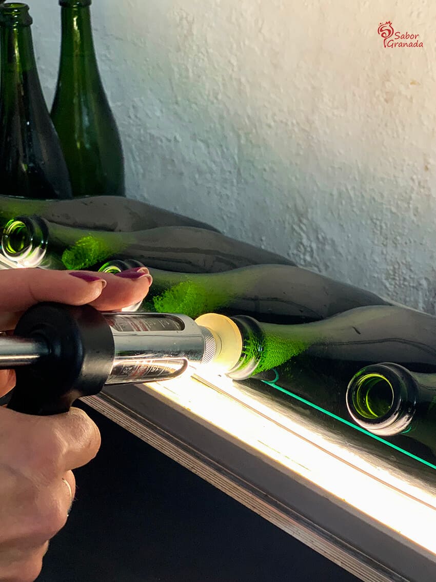 Otra de las bases del pastel lleva una gelatina de vino espumoso que envuelve los quesos de cabra pequeños. El vino espumoso que he usado es el Brut Nature de Bodegas Carayol & Castellar. Como os decía hace unas semanas, también tuve ocasión de visitar la bodega y vivir en directo el proceso de degüelle del vino espumoso. Todo un arte hecho a mano, botella a botella, que no hace más que subir el valor de uno de los pocos vinos espumosos que se hacen en la provincia de Granada.