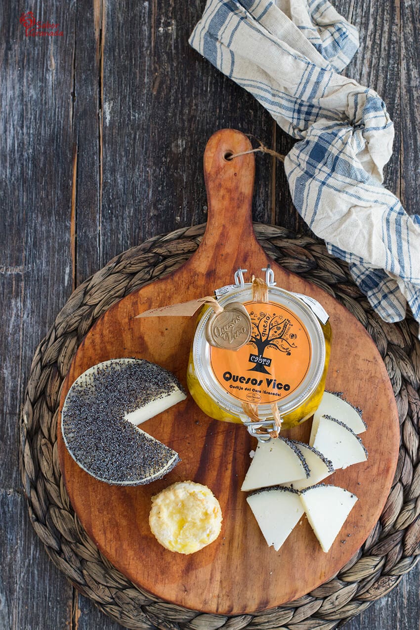 Los quesos que he usado son de la Quesería Vico, un lugar idílico que nos encontramos entre Galera y Castillejar, es un complejo rural, con alojamiento en cuevas donde se encuentra también la quesería y donde podemos aprovechar para realizar multitud de actividades de ocio. Los quesos que hemos usado para la receta son el semicurado con semillas de amapola y medallones de queso de cabra en aceite, los dos realmente exquisitos.