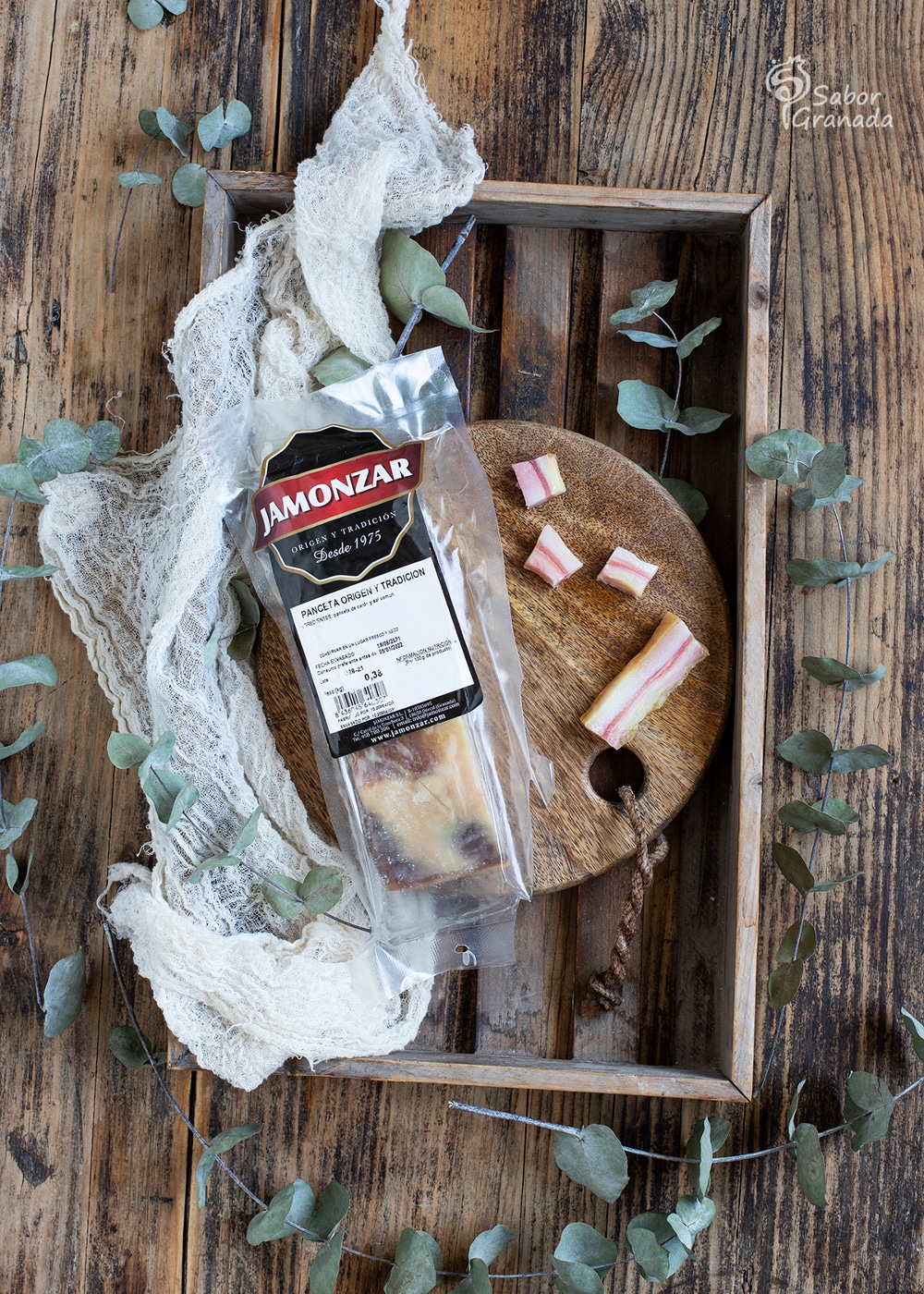 Hemos usado también panceta origen y tradición de Jamonzar, piezas curadas de cerdos San Pascual de su granja. La curación que atraviesan es natural, prolongada y muy cuidada, junto con la materia prima y maceración, los embutidos recrean sabores bien asentados y multitud de aromas especiados.