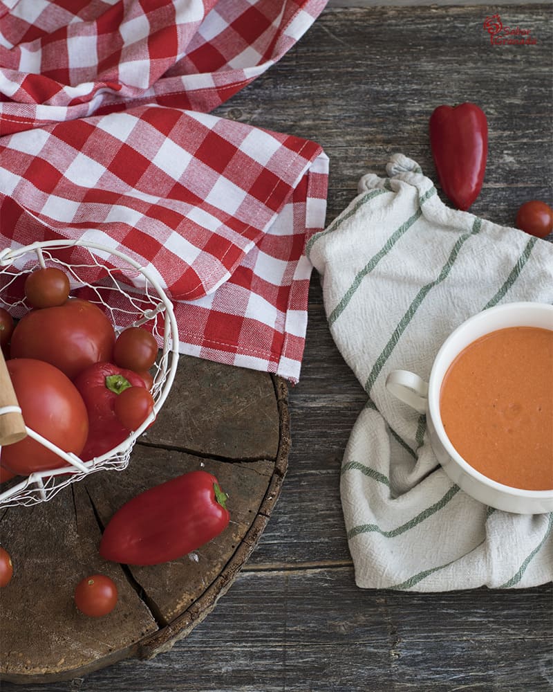 Trituramos los tomates con piel con la Thermomix o una batidora potente. Reservamos. Pasado el tiempo de maceración añadimos los ingredientes macerados al vaso de la batidora vacía o Thermomix y vamos añadiendo el AOVE hasta que se integre, por último juntamos el tomate triturado junto con el pan, batimos un poco hasta que se integre y rectificamos de sal si fuese necesario. Refrigeramos y servimos bien frío.