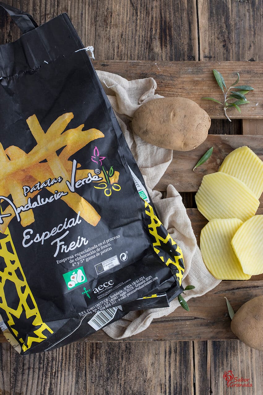Las patatas fritas las hemos elaborado con las Patatas de Eduardo Sanz, de la Gama Andalucía Verde, especiales para freír. El envase de papel tiene unas propiedades que mejoran sensiblemente la conservación de la patata. Evita el verdeo del tubérculo, impidiendo la exposición a la luz, reduce la germinación de la patata y favorece una mejor conservación de la calidad culinaria de la misma