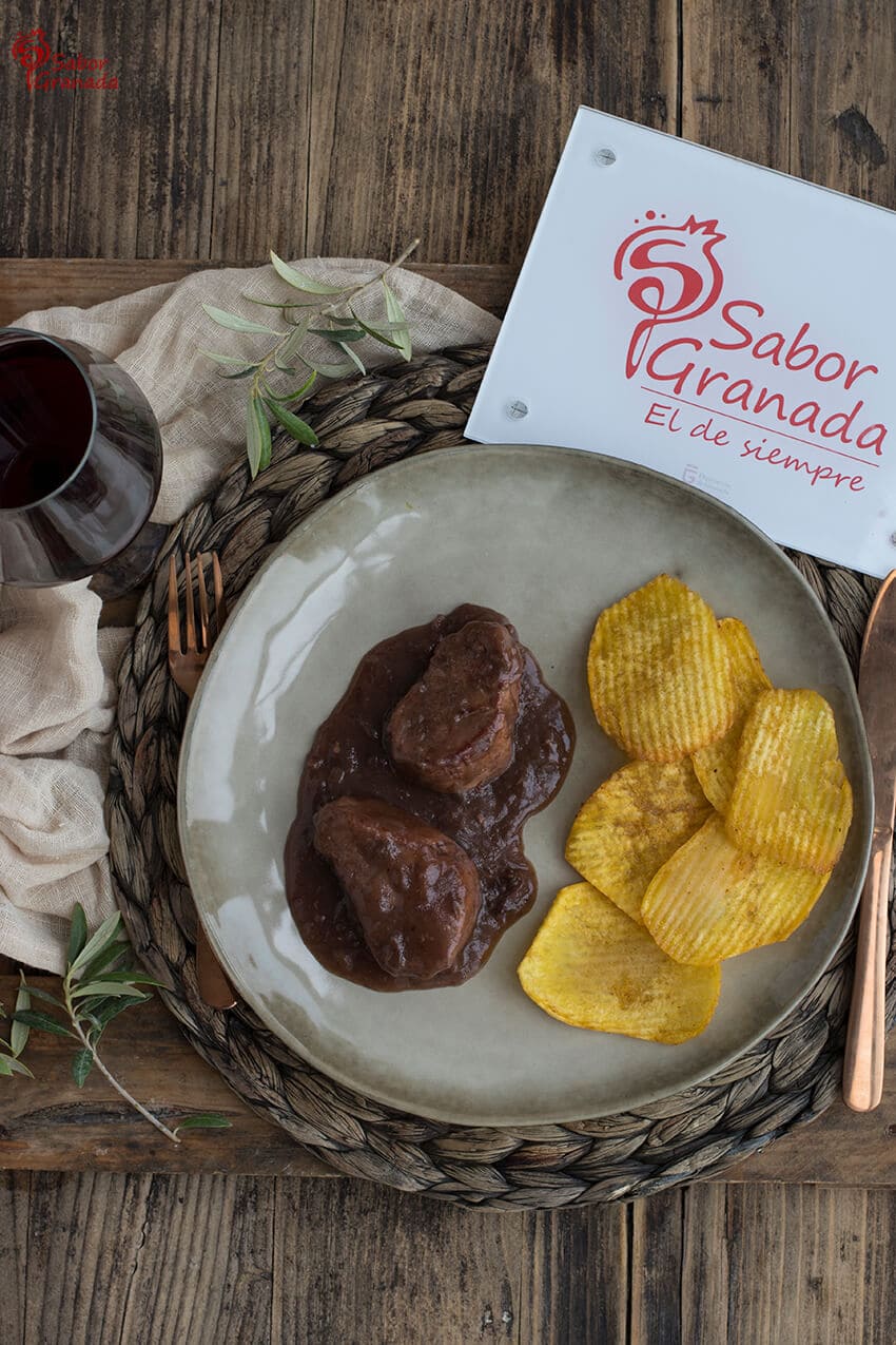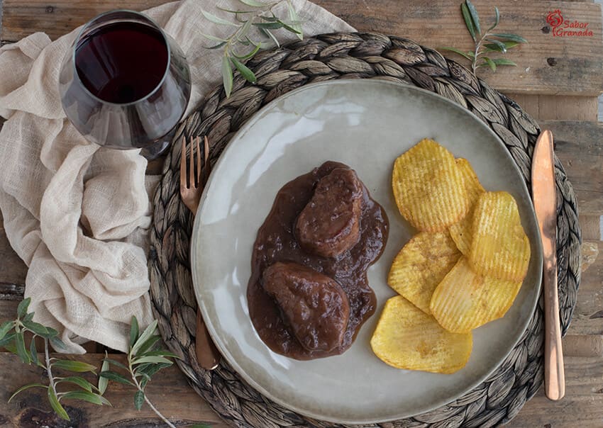 Una vez sellados sacamos y en el mismo aceite rehogamos la cebolla cortada en juliana. Añadimos el vino semidulce y dejamos hasta que reduzca. Entonces añadimos de nuevo la carne, junto con el vaso de caldo con la cucharada de maicena desleída en él. Dejamos a fuego lento durante una media hora o hasta que veamos que la carne está tierna, cuidando de que no se nos queme la salsa.