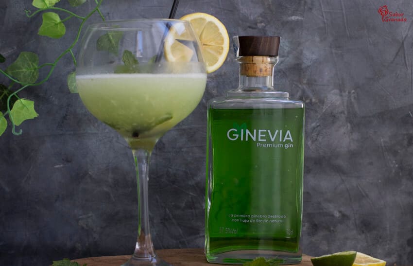 Pero la ginebra que hemos usado para la receta no es una ginebra cualquiera, se trata de la nueva ginebra granadina Ginevia. Ginevia es la primera ginebra hecha con hojas de estevia naturales, una ginebra saborizada sin azúcares añadidos. Su color verde intenso, que evoca el color de las hojas de estevia, le confiere una atracción natural. Tiene sabor refrescante, aunque no renuncia a la esencia del mejor destilado.