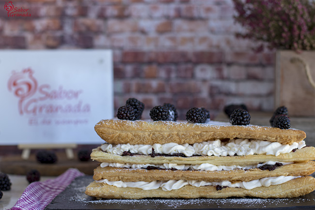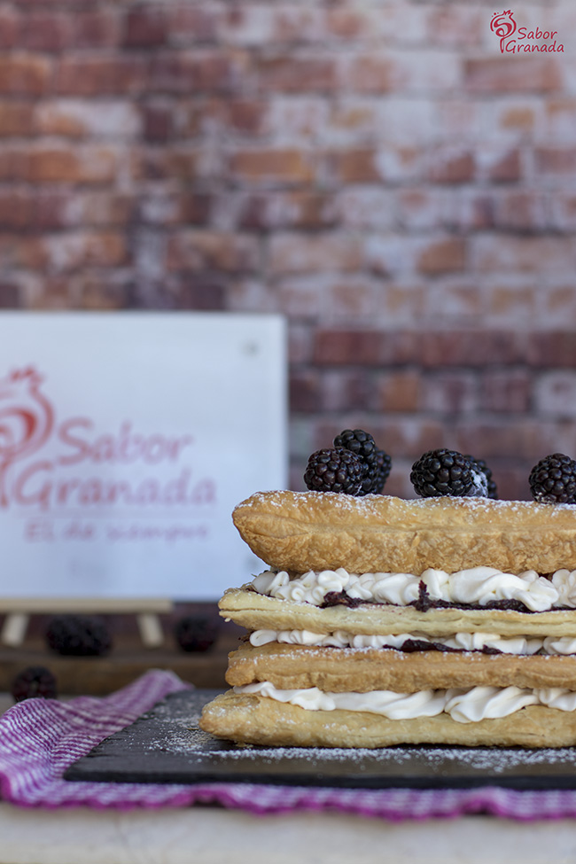 Cuando probé, hace unas semanas, la carne de moras de Plain & Simple en la Feria Sabores de nuestra Tierra, en FERMASA, quedé cautivada por el sabor y por la textura. De primeras pensé en preparar una tarta de queso y ponérsela de cobertura, aunque se puede hacer perfectamente, pensé que era mejor untarla sobre unas planchas de hojaldre y preparar esta tarta milhojas. Desde la empresa sita en Deifontes han conseguido hacer una elaboración parecida a la carne de membrillo tan típica de esta época, pero con moras. La consistencia que han conseguido es una intermedia entre la mermelada y las carnes de membrillo más cuajadas que podamos encontrar. Como he dicho se puede poner de cobertura en tartas, usar para untar en una tosta de pan con queso crema, combinarla en salsas con platos salados o untarla en estas planchas de hojaldre, como os muestro yo. De todas maneras en la web de la empresa podéis encontrar numerosas recetas con todos los productos de la marca que prepara la misma Susan, alma máter de Plain & Simple.