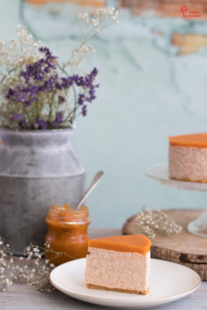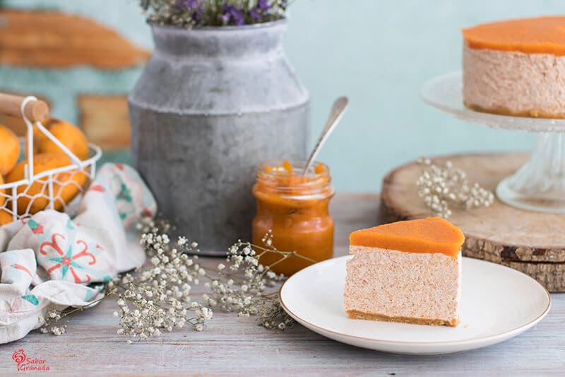 Al día siguiente ponemos a hidratar 3 hojas de gelatina en agua fría, una vez hidratadas disolvemos en un poquito de agua caliente y añadimos a la mermelada de níspero. Sacamos la tarta y se lo añadimos a modo de cobertura, introducimos de nuevo en la nevera una hora o dos hasta que la cobertura cuaje. A partir de entonces podremos servir.