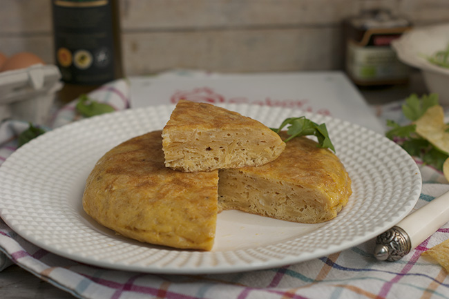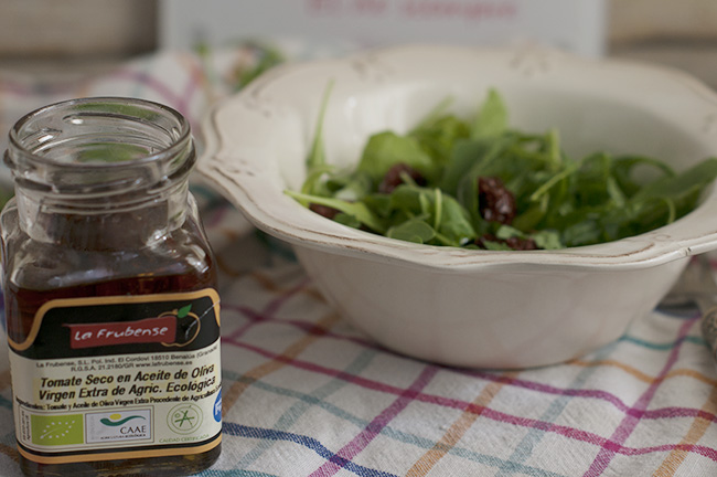 La tortilla la hemos acompañado con una ensalada de rúcula y tomates secos en aceite de oliva de La Frubense, empresa de Benalúa de Guadix pionera en la producción y elaboración de frutas y hortalizas secas y deshidratadas procedentes de la agricultura ecológica. Pone a nuestra disposición una amplia gama de frutas y verduras secas y deshidratadas acorde a los más exigentes paladares gourmet, desde piña y mango deshidratado, berenjena, calabaza, setas deshidratadas hasta conservas como estos tomates secos en aceite o paté de tomates secos.