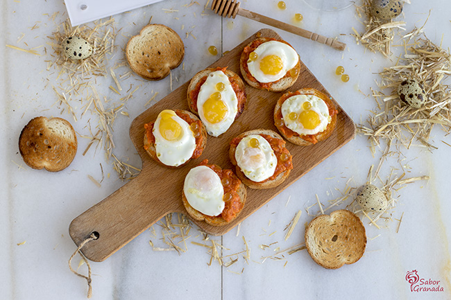Los aperitivos son una parte importante de nuestra cocina, de hecho en mi casa son los que más importancia tienen, es la parte de la cena o comida más distendida y relajada, a veces los tomamos de pie, y luego nos sentamos para los platos principales. En esta ocasión el bocado es de lujo, una base de pan tostado untado con sobrasada con un huevo frito de codorniz y coronando la preparación unas perlas explosivas de miel.