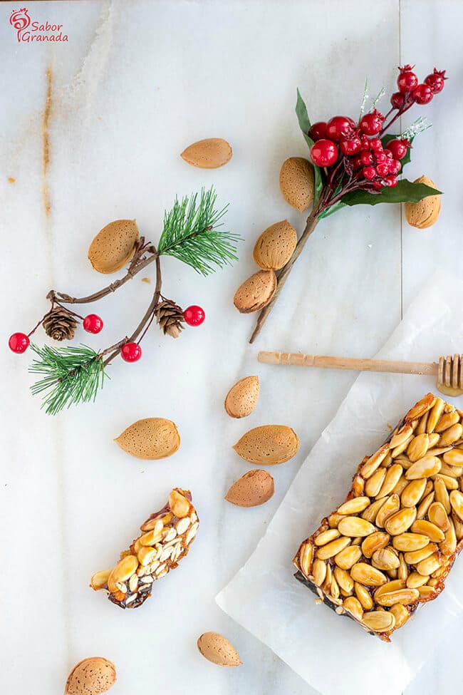Mezclamos el caramelo con las almendras, hasta que las almendras queden impregnadas del caramelo. Preparamos un molde rectangular (yo lo he hecho en uno de madera especial para turrón, pero podéis hacerlo en uno especial de acero inoxidable, o, en su defecto, en un cartón de leche cortado por la mitad, lo importante es que sea cual sea lo forremos con papel vegetal, para evitar que se nos pegue el turrón). Vertemos la mezcla en el molde y con una espátula aplanamos bien por arriba para que se quede uniforme. Dejamos a temperatura ambiente hasta que se endurezca. Entonces sacamos del molde y despegamos del papel con cuidado. Podemos hacerle un bonito envoltorio para presentarlo o regalarlo.